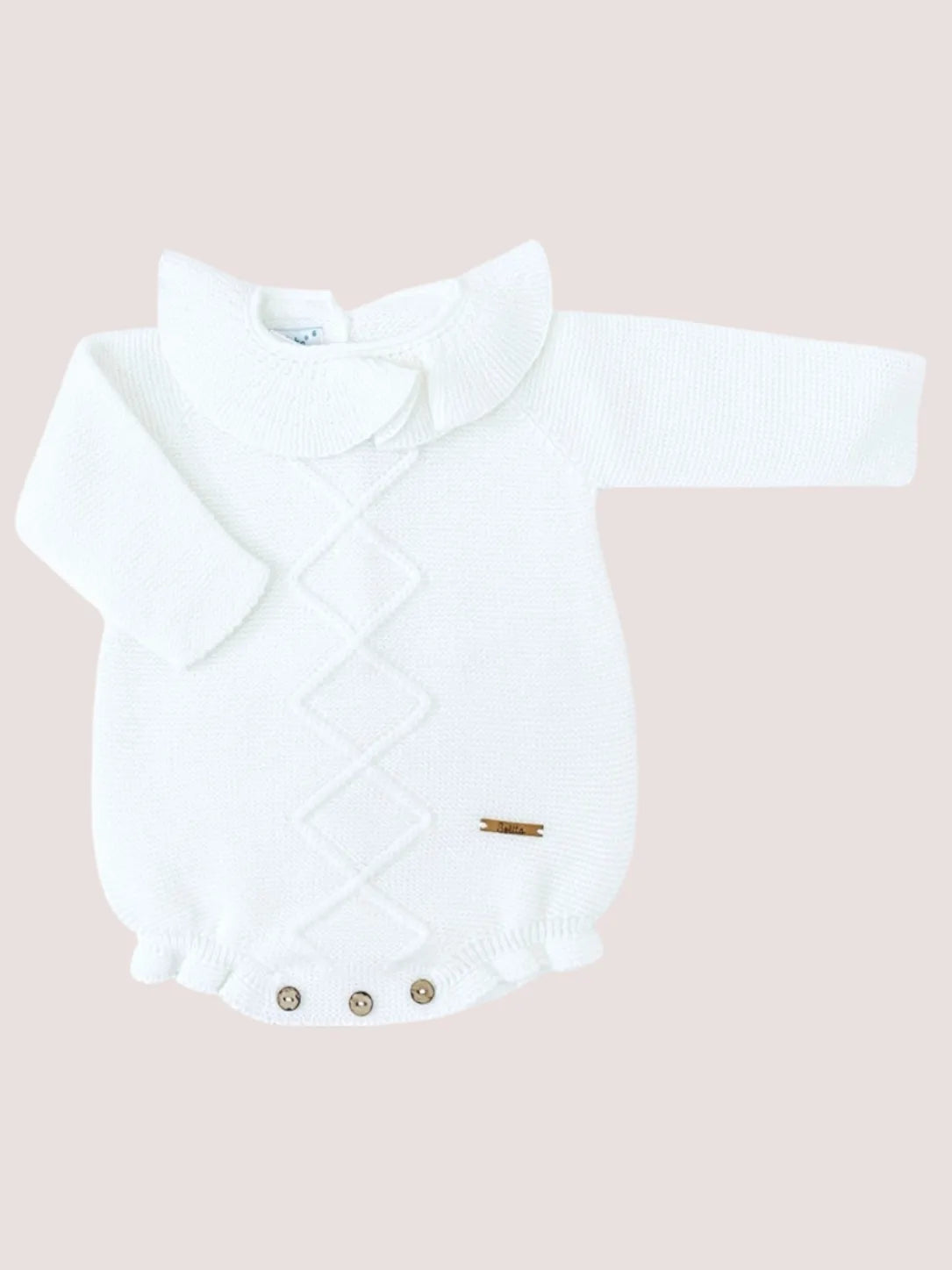 Precio unitario porEl Pelele Nieve de Punto Solita es una prenda exclusiva y elegante , diseñada para proporcionar el máximo confort a tu bebé. Fabricada en lana blanca de alta calidad , esta piel ofrece una suavidad inigualable, ideal para mantener a tu pequeño abregado en los días más fríos. Su diseño se realiza con un delicado cuello de volante y una línea central con rombos bordados , que le otorgan un toque cómodo y único.