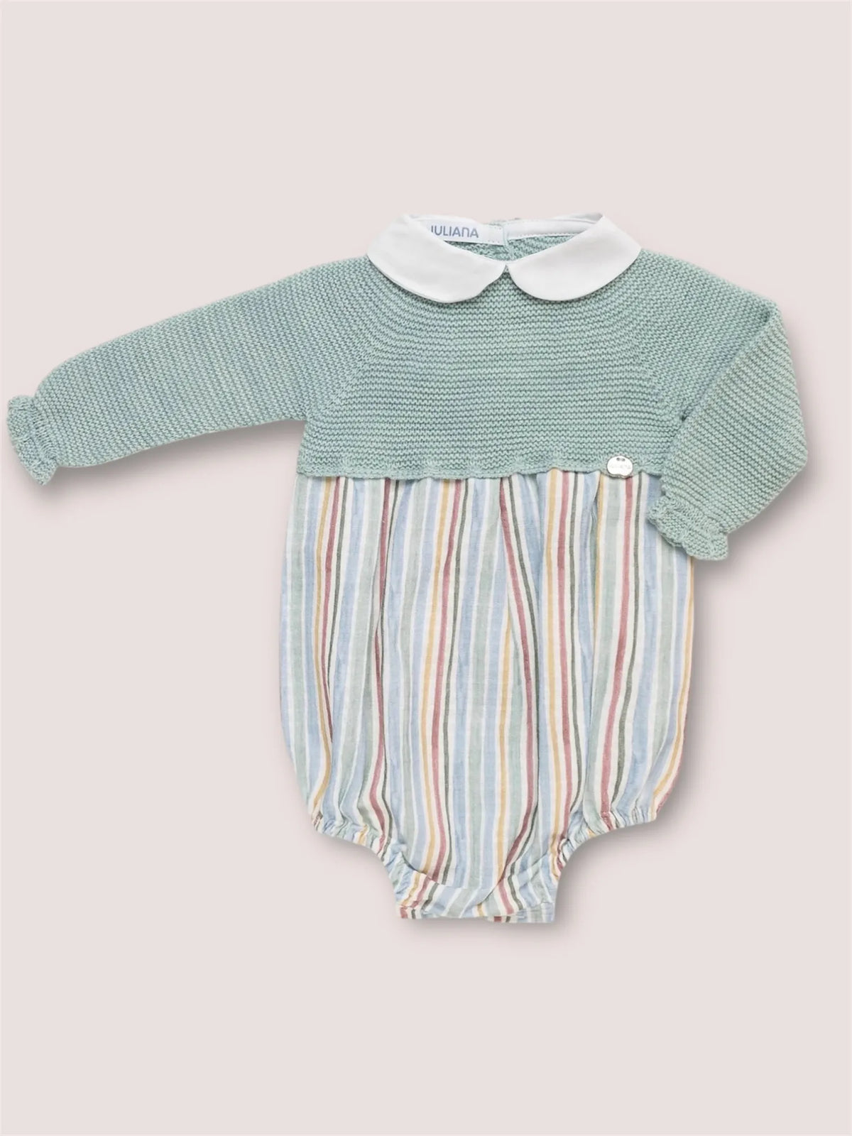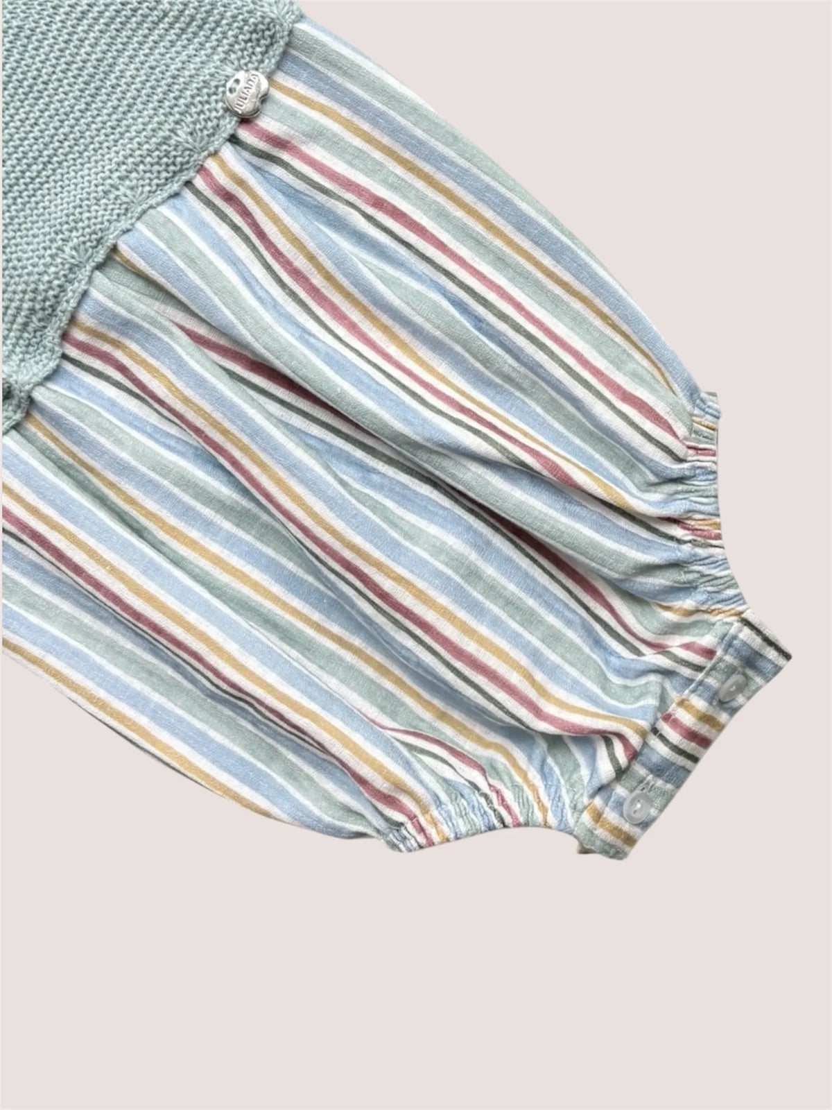 En la zona inferior del pelele, encontrarás un  estampado en tela con líneas verticales en tonos pastel , que le dan un toque de color y dinamismo sin sobrecargar el diseño. Este detalle aporta alegría y ternura al conjunto, ideal para resaltar la dulzura de tu bebé.
