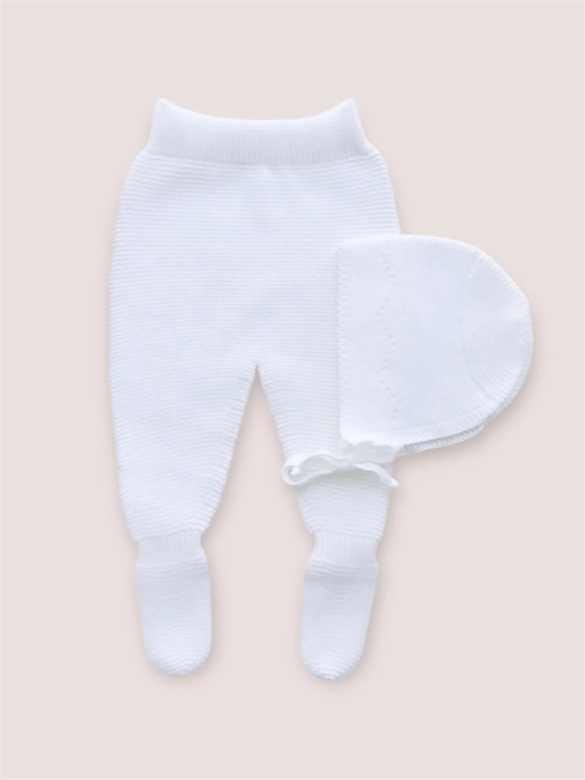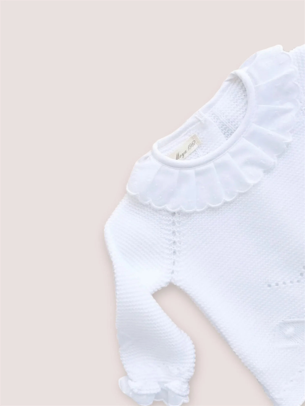 La capota mantiene el diseño del jersey con las líneas caladas en “w” y un delicado remate bordado en la parte superior . La polaina, de talle alto y corte sencillo , completa el conjunto aportando comodidad y libertad de movimiento para el bebé.