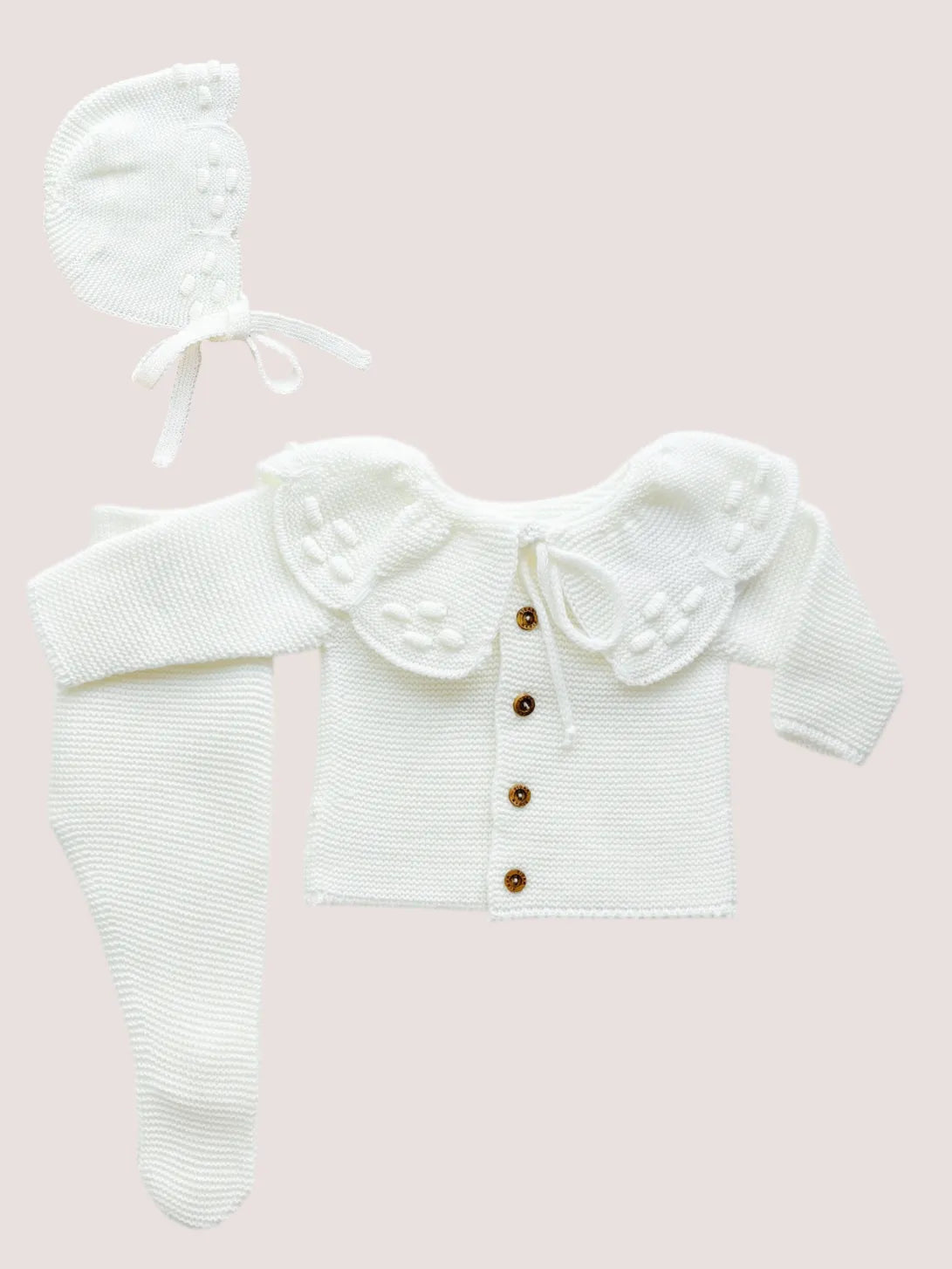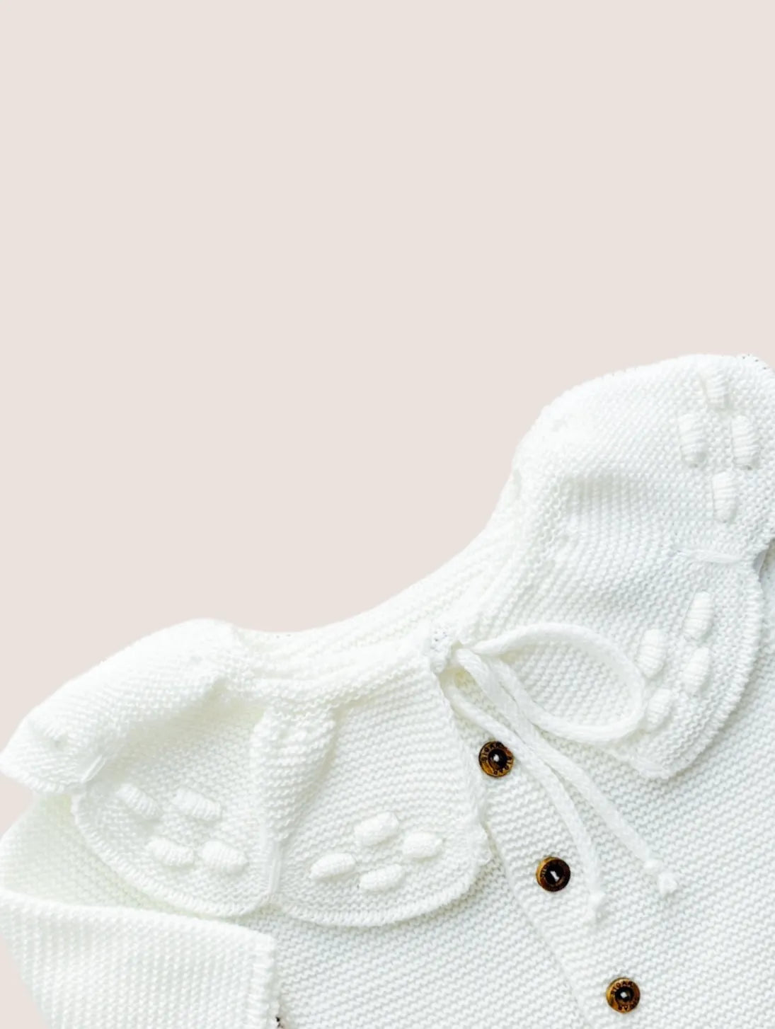 El conjunto se presenta en un elegante color crudo, que transmite pureza y serenidad, y resulta fácil de combinar con otros accesorios. El jersey destaca por su espectacular cuello redondo, enmarcado con delicados bodoques del mismo tono, que aportan un toque artesanal y refinado. En el centro, una lazada decorativa añade un detalle romántico que realza la dulzura del diseño. Los botones de madera en la parte delantera no solo facilitan el cambio de ropa, sino que también aportan un acabado cálido y natural que complementa la estética del conjunto.