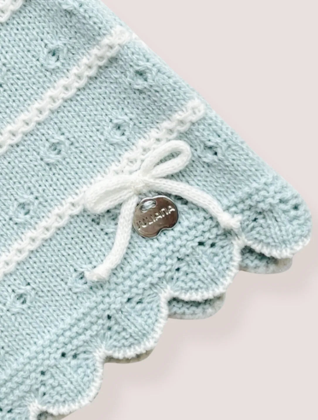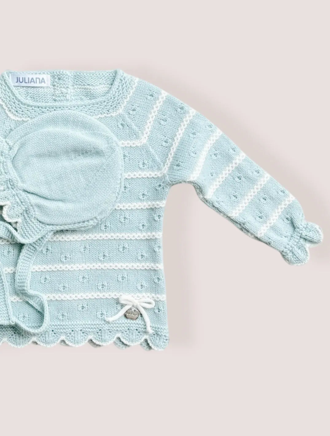 Compuesto por una capota en verde agua con ondas en su parte frontal, una polaina en el mismo color y un jersey de lana suave. Cada detalle está pensado para brindar calidez sin sacrificar el estilo. La combinación de líneas en tonos en crudo y su totalidad verde agua le da un aire suave y natural, ideal para cualquier ocasión. Además tiene un diseño calado que le da un toque personal y único.