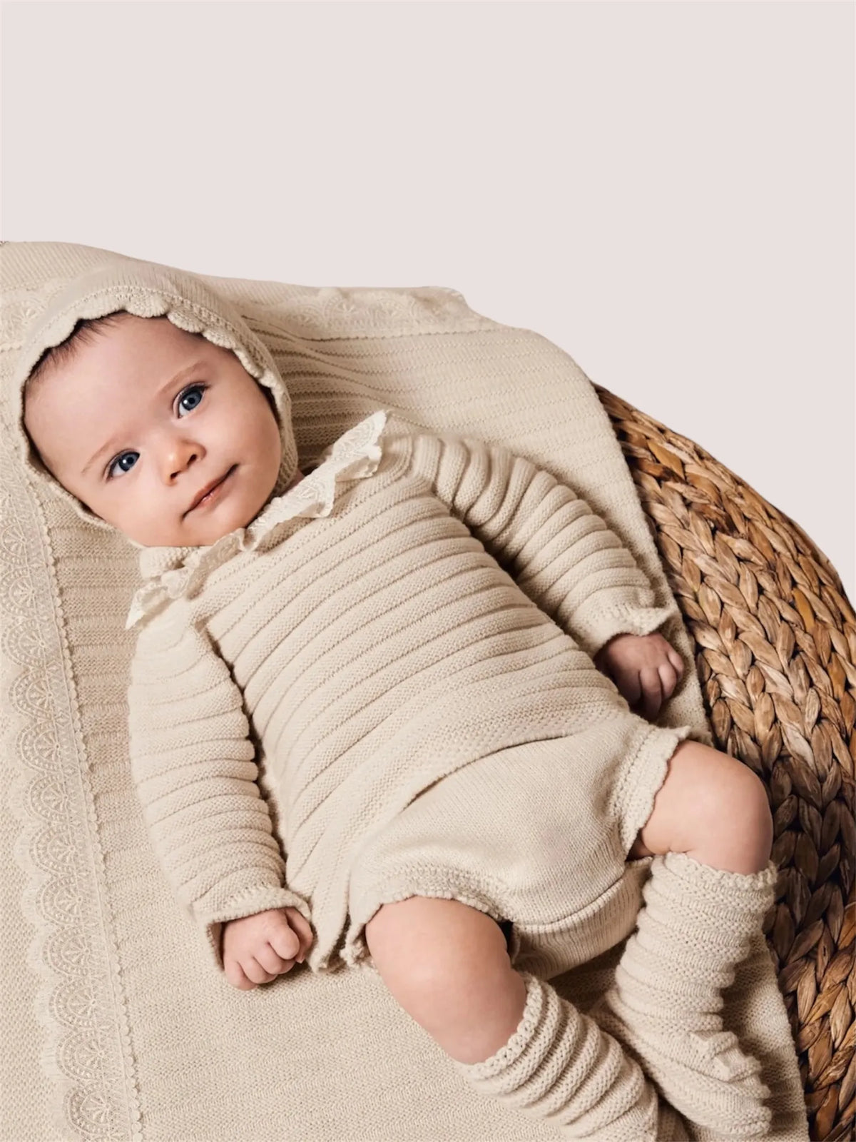 La prenda principal destaca por su jersey de cuello calado exquisito , un detalle artesanal que aporta un toque de sofisticación y elegancia. A lo largo del jersey se extienden líneas horizontales suaves que le dan textura sin sobrecargar el diseño, logrando un equilibrio perfecto entre clasicismo y modernidad. Los patucos altos , también con líneas horizontales , complementan el conjunto con un estilo coordinado y adorable.