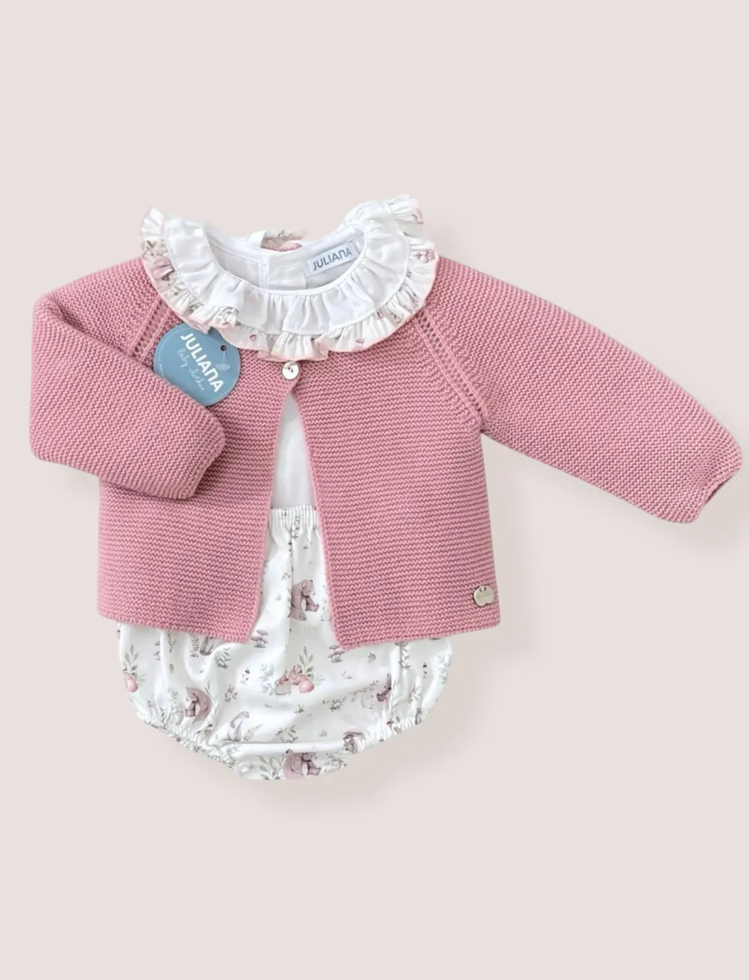 Precio unitario porEl Conjunto Nube Maquillaje de Juliana es una elección encantadora para vestir a tu bebé con estilo y comodidad. Este conjunto incluye una delicada chaqueta de lana en color rosa maquillaje, diseñado con dos botones en la parte superior delantera para un ajuste cómodo y un toque elegante. El logo de Juliana, situado en la parte inferior izquierda, añade un detalle exclusivo que destaca la calidad y distinción de la prenda.