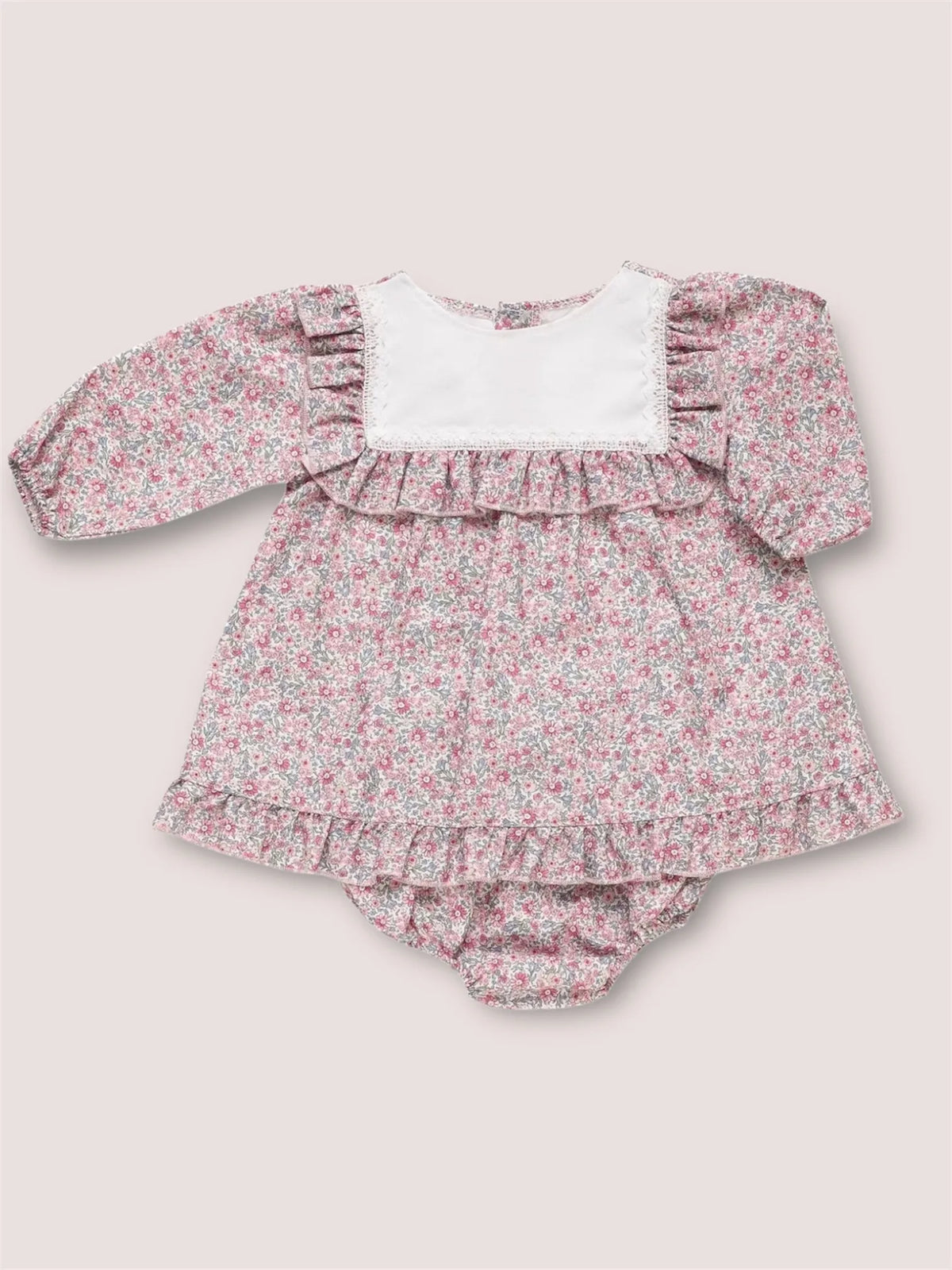 La parte inferior del vestido incorpora un gracioso volante que aporta volumen y dinamismo, haciendo que cada movimiento sea aún más adorable. Además, incluye una braguita con el mismo estampado floral, asegurando un look coordinado, cómodo y funcional.