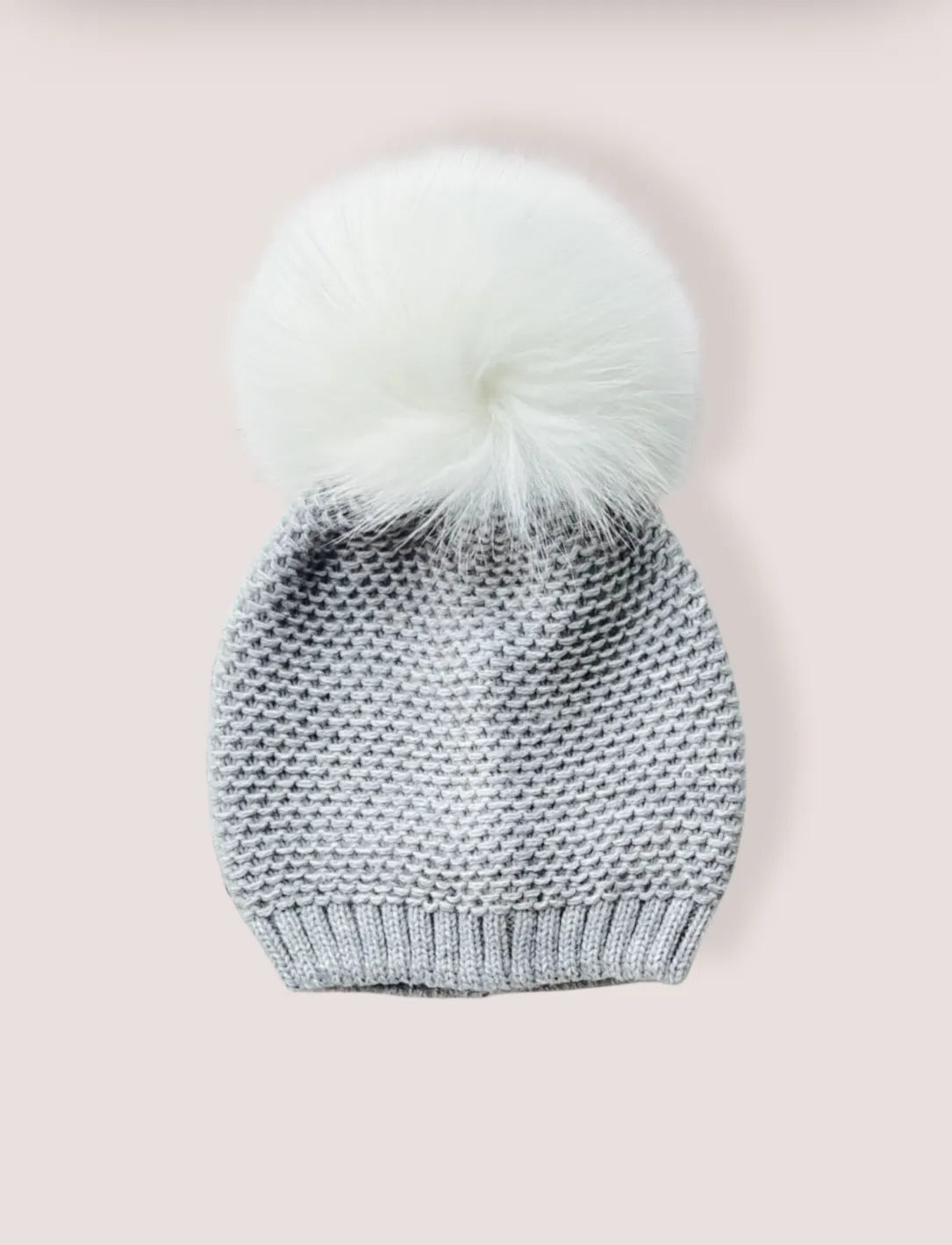 Un toque distintivo es el logo metálico de Juliana ubicado en la parte inferior izquierda, reforzando el sello de calidad y tradición de la marca. Además, incluye un adorable gorro con gran pompón hecho en pelo blanco , que complementa el conjunto con un toque de ternura y estilo.
