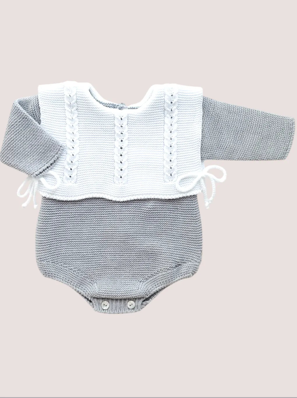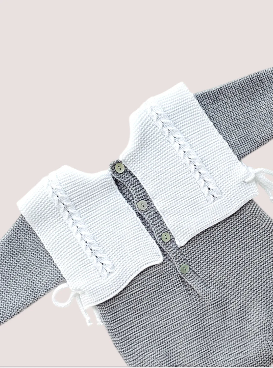 El color Gris del pelele Siberia aporta una estética moderna y neutra, fácil de combinar con otros accesorios del bebé. Su espectacular baberola en color Blanco añade un toque clásico y refinado, enmarcando el rostro del bebé con dulzura y realzando el diseño con un contraste delicado. Este detalle, cuidadosamente elaborado, evoca la tradición de la moda infantil más artesanal, sin renunciar a la comodidad ni a la practicidad que exige el día a día de los más pequeños.