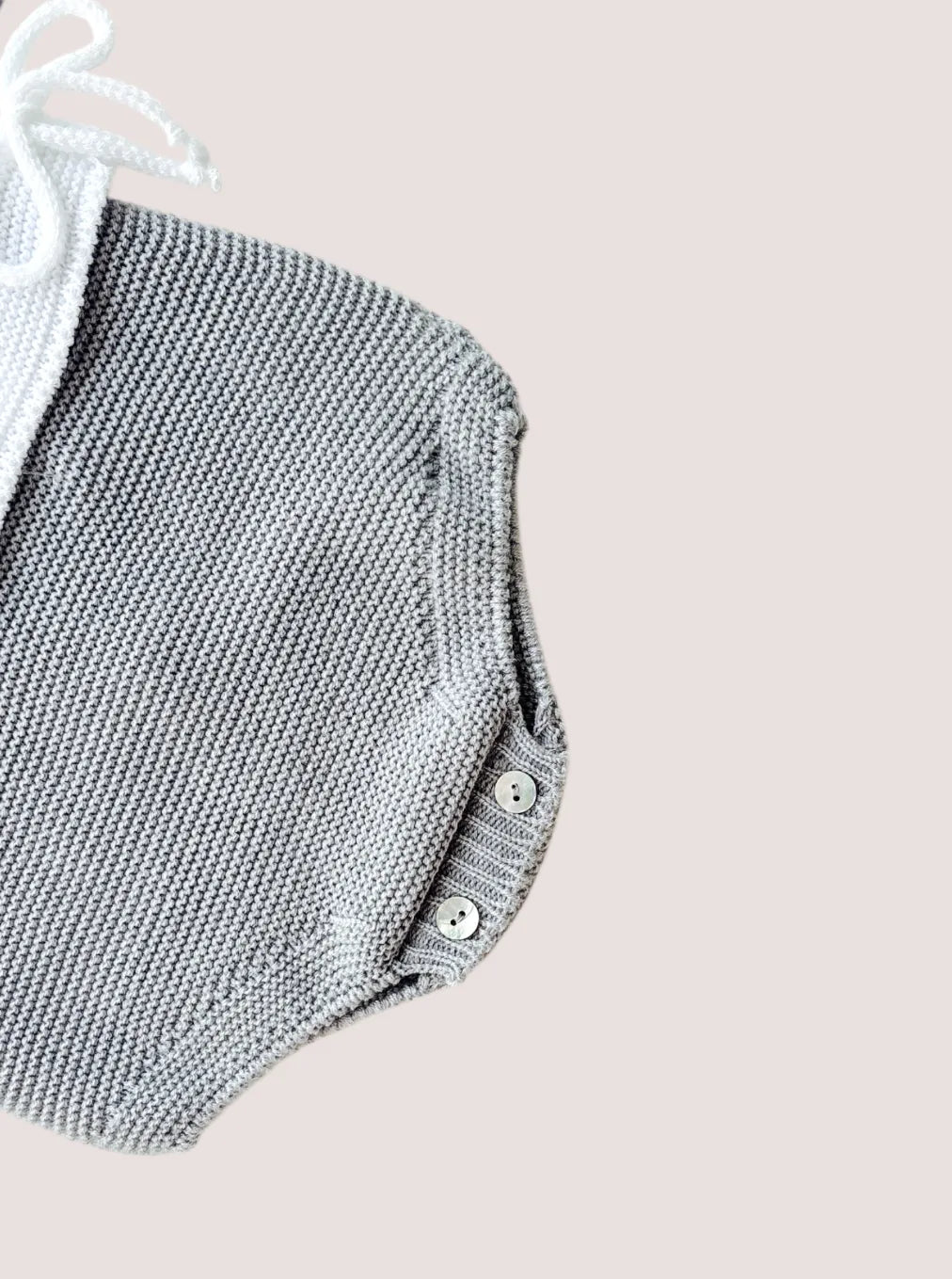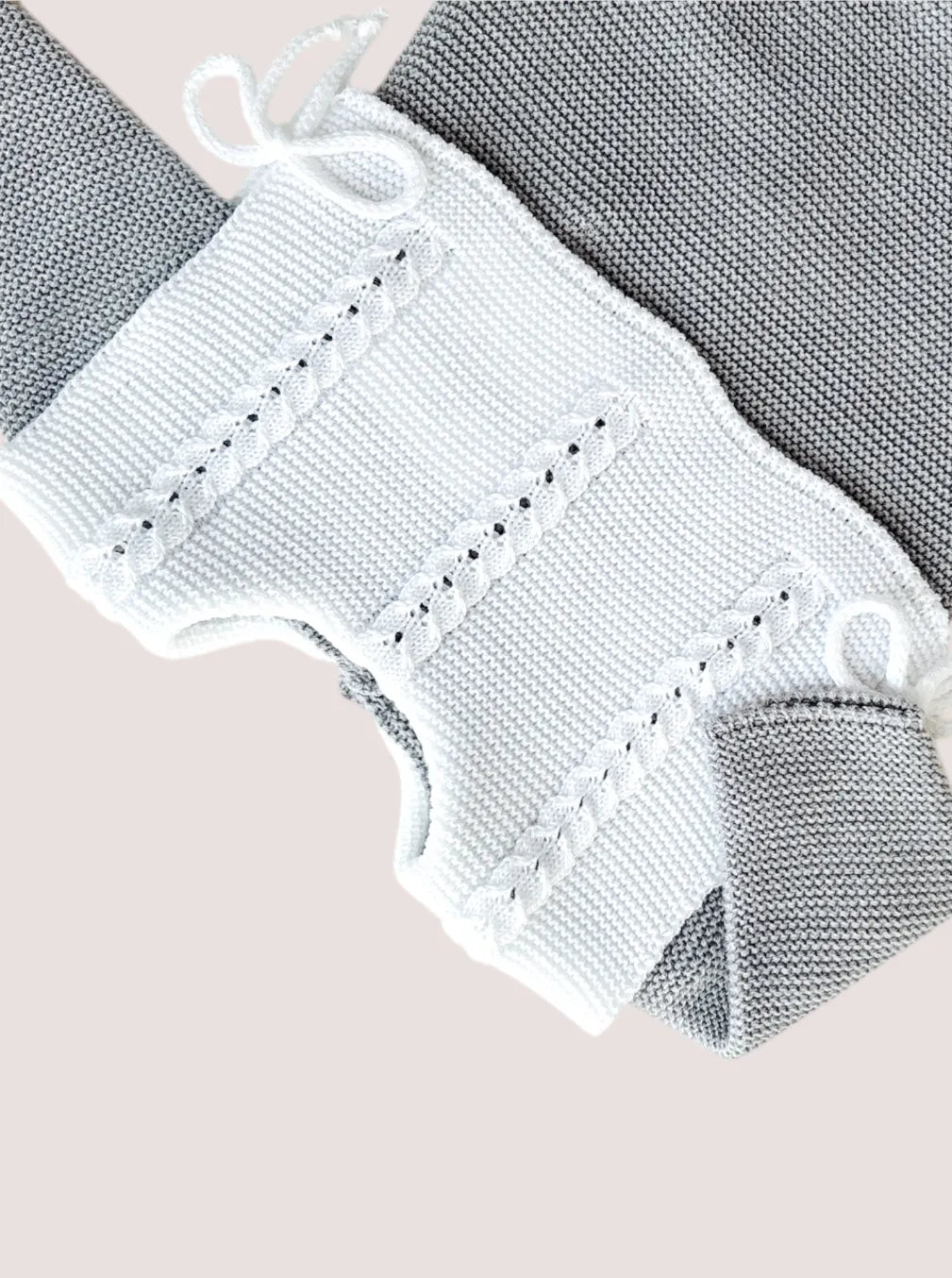 El color Gris del pelele Siberia aporta una estética moderna y neutra, fácil de combinar con otros accesorios del bebé. Su espectacular baberola en color Blanco añade un toque clásico y refinado, enmarcando el rostro del bebé con dulzura y realzando el diseño con un contraste delicado. Este detalle, cuidadosamente elaborado, evoca la tradición de la moda infantil más artesanal, sin renunciar a la comodidad ni a la practicidad que exige el día a día de los más pequeños.